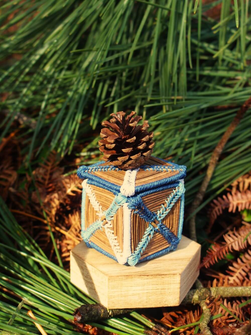 Petite boîte à trésors des Landes fabriquée en aiguilles de pin naturelles.