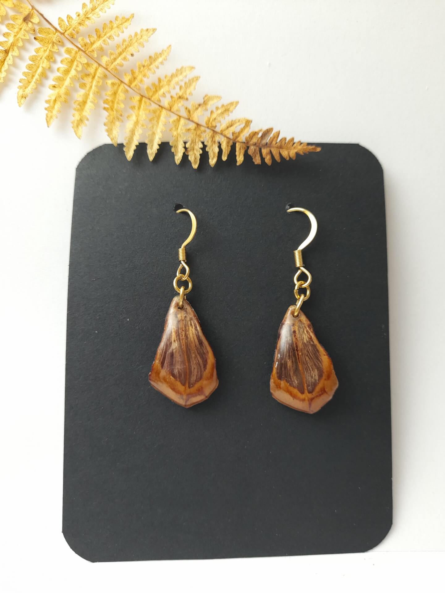 Boucles d’oreilles écailles de pigne (pomme de pin) résinées.